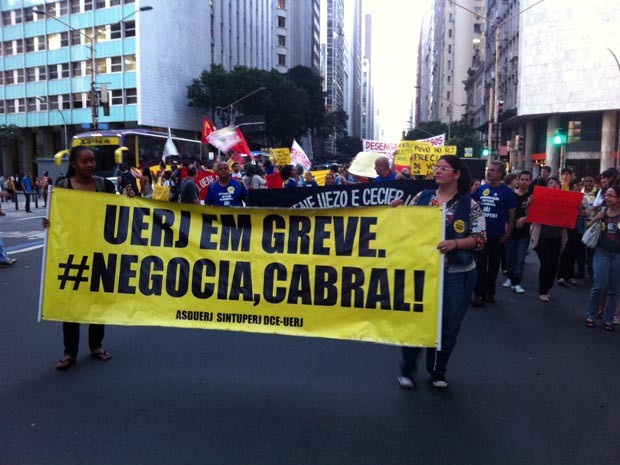 Estudantes, professores e técnicos da Universidade do Estado do Rio de Janeiro (Uerj) ocuparam três faixas da Avenida Rio Branco, no fim da tarde desta quarta-feira (29), durante o protesto de servidores em greve. De acordo com a Polícia Militar, por volta das 17h30, cerca de 150 manifestantes ocuparam a via. Durante o ato, apenas a faixa do BRS ficou liberada ao trânsito. O grupo protesta contra a ausência de propostas do governo do estado para terminar o impasse. Além da Uerj, quatro universidades federais do Rio de Janeiro estão paralisadas.